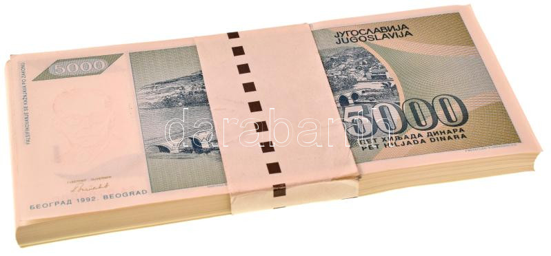Jugoszlávia 1992. 5000D (100x) sorszámkövetők "ZA0789501 - ZA0789... https://www.darabanth.com/de/457-Fernauktion/457.0/Numismatik/Weltweit-Banknoten~15/Jugoszlavia-1992-5000D-100x-sorszamkovetok-ZA0789501-ZA0789600-kotegelovel-TUNC-AU-Y~II3061153