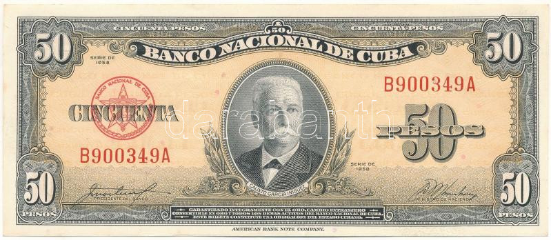 Cuba 1958. 50... https://www.darabanth.com/de/457-Fernauktion/457.0/Numismatik/Weltweit-Banknoten~15/Kuba-1958-50P-piros-sorszam-B900349A-TUNC-Cuba-1958-50-Pesos-red-serial-B900349A-CUNC-Kra~II3051988