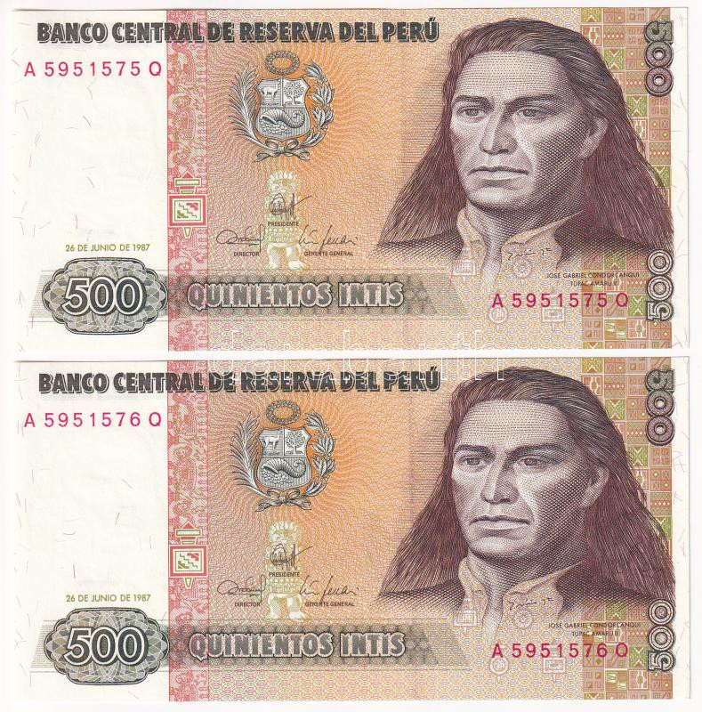 Peru 1987. 500 Intis (2x... https://www.darabanth.com/de/457-Fernauktion/457.0/Numismatik/Weltweit-Banknoten~15/Peru-1987-500I-2x-sorszamkovetok-TUNC-AU-Peru-1987-500-Intis-2x-consecutive-serials-CUNC~II2920109