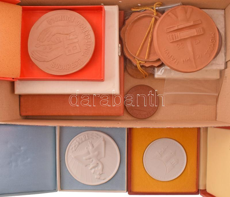 13db-os, főleg külföldi (és néhány magyar) porcelán- és kerámia emlékéremből álló tétel tokkal és anélkül, közte több darab a "Meisseni Porcelánmanufaktúra" gyártói jelzésével