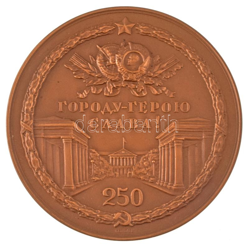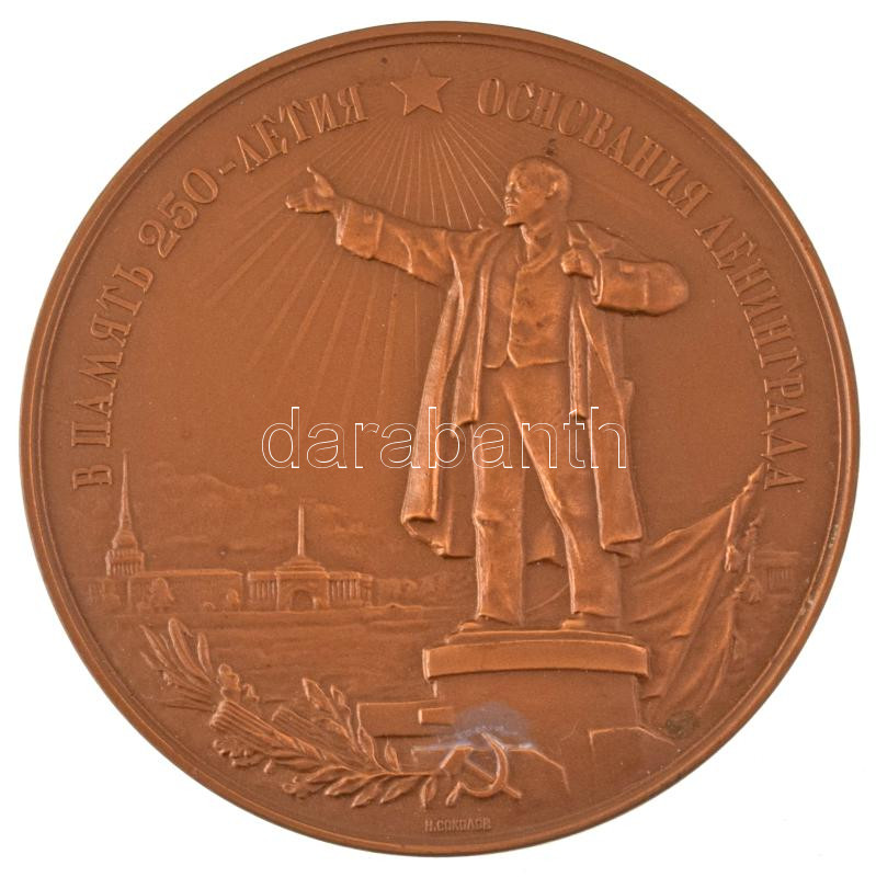 Szovjetunió 1957. "Leningrád alapításának 250. évfordulójára / Dicsőség a hős városnak" orosz nyelvű, kétoldalas bronz emlékplakett (76mm) T:AU Soviet Union 1957. "250th Anniversary - Founding of Leningrad / Glory to the Hero City" russian inscripted double-sided bronze plaque (76mm) C:AU