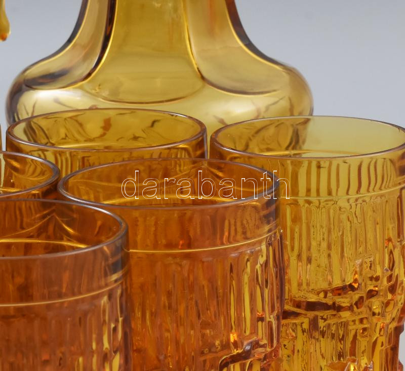 Borostyán színű üveg kancsó 23 cm + 6 db üveg pohár https://www.darabanth.com/de/457-Fernauktion/457.0/Porzellan-Keramik-Glass/Glaser~500009/Borostyan-szinu-uveg-kancso-23-cm-plus-6-db-uveg-pohar~II3018672