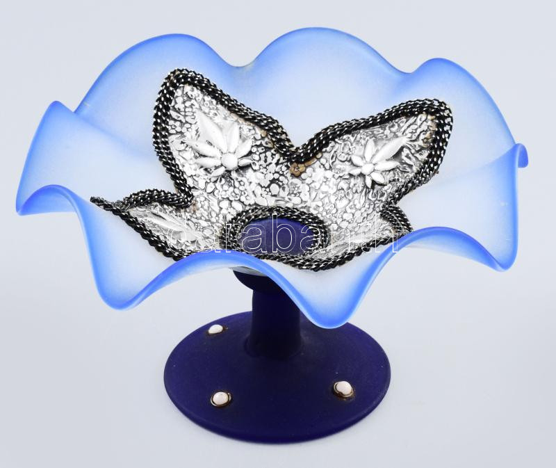Beschreibung: Kék üveg kínáló, díszítményekkel, d: 19 cm, m: 11 cm