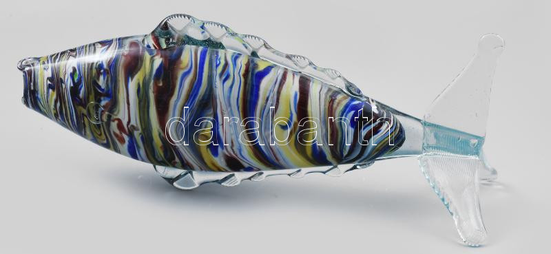 Beschreibung: Murano hal, anyagában kék alapon különböző színekkel színezett, háromágú uszonnyal, jelzés nélkül, hibátlan, h: 32 cm