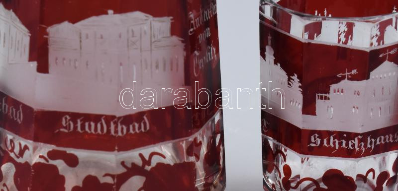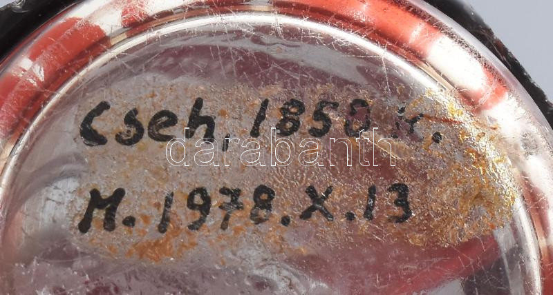 Beschreibung: Teplitz Felvidék emlék üveg XIX. sz közepe. Csiszolt, kézzel festett, az épületek képeivel feliratos, hozzá pohárka 12 cm, 5,5 cm