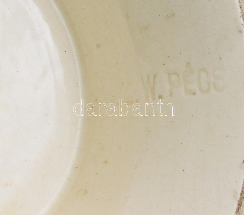 Beschreibung: 1874 körül, Zsolnay virágmintás díszváza. Festett porcelánfajansz. Szűkülő talpról szélesedő gömbölyded vázatesten mézsárga csíkokkal tagolt mezőkben stilizált pázsitminta, illetve medalionokban krizantém- és liliomminták. Jelzett: alján masszába nyomott Z.W. PÉCS felirat és formaszám. Kis kopással, m: 21,5 cm
