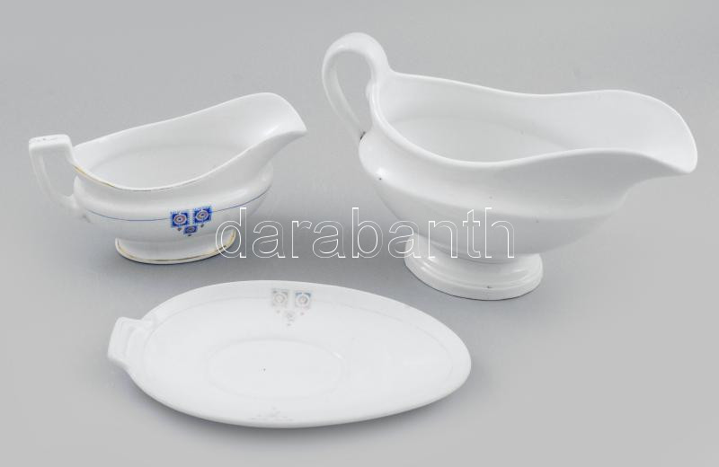 Beschreibung: 2 db porcelán szószós kiöntő, jelzés nélkül, egyik alátét tányérral 20,27 cm
