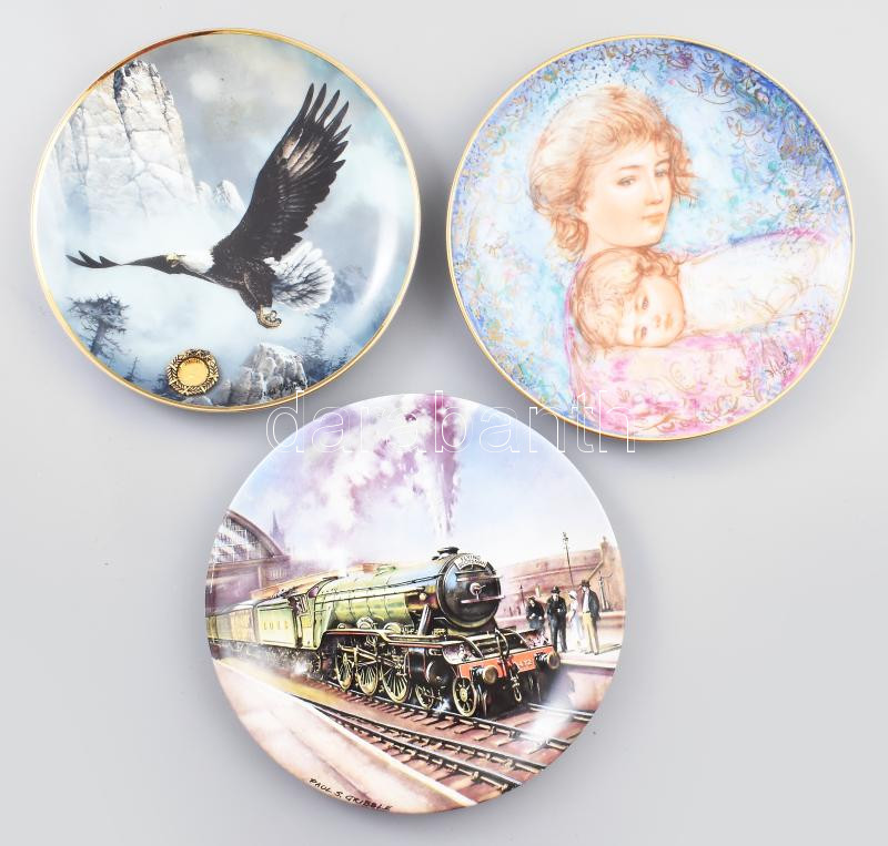 Beschreibung: 3 darab amerikai gyűjtői porcelán dísztál, jelzett, egyiken pattanással, d: 20-22 cm