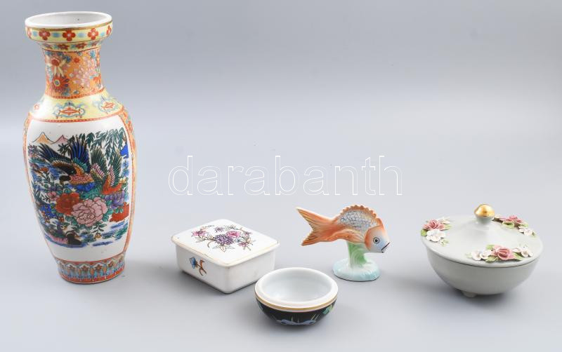Beschreibung: 5 darabos porcelán tétel, közte kínai váza, Hollóházi bonbonier és hal, Herend bonbonier alj, vegyes méret és állapot