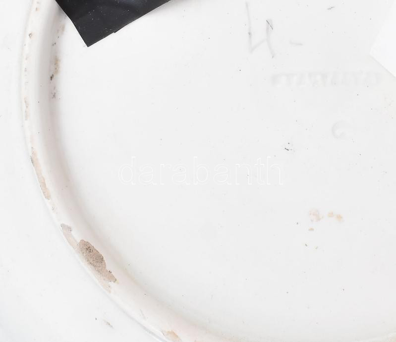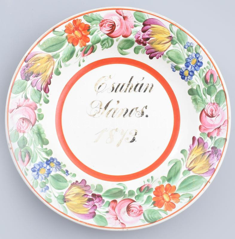 Beschreibung: Apátfalva, 1873, Dísztál. Csukán János. 1873 felirattal, jelzett, kis sérüléssel és hátoldalán hiánnyal, d: 22,5 cm