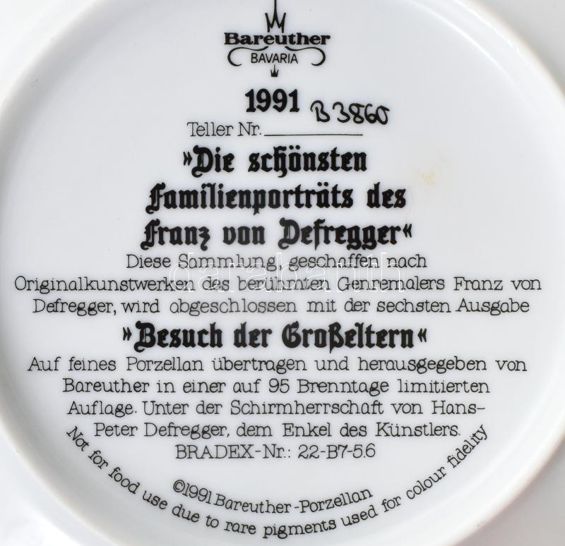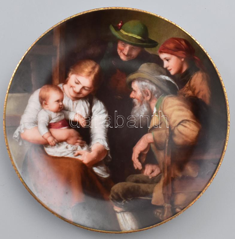 Beschreibung: Bareuther Bavaria porcelán fali dísztányér, Franz von Defregger sorozat, "Besuch der Großeltern". Matricás, jelzett, számozott, hibátlan, d: 20 cm