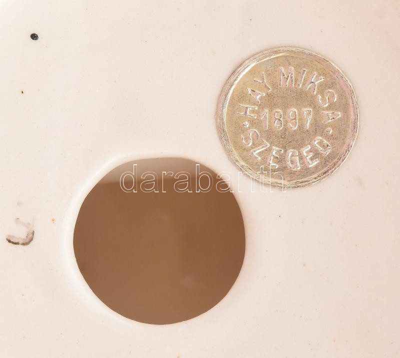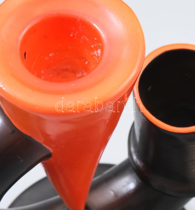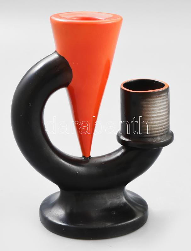 Goebel art deco gyertyatartó. Klasszikus art deco geometrikus formavilág: fordított kúpot körülölelő hajlított csőalak, fekete és narancssárga mázakkal festve, szélső elemen recézett gyufagyújtó felülettel. Alján kereskedői címke: "Hay Miksa Szeged 1897". Minimális kopottsággal, m: 14,5 cm