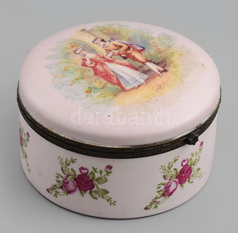 Beschreibung: Historizáló mintás bonbonier, jelzett, kopott, d: 14 cm, m: 8 cm