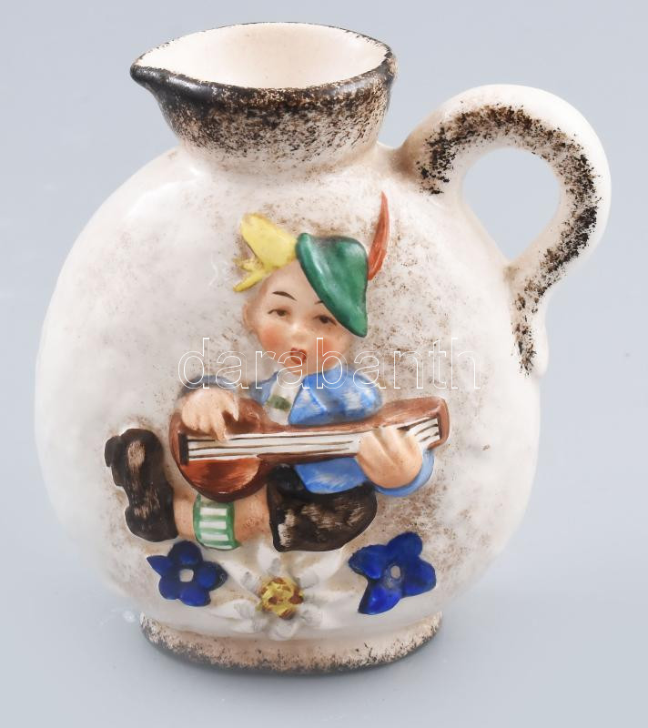 Beschreibung: Hummel kiöntő, kézzel festett, gitározó fiú alakjával díszített fajansz, jelzett, hibátlan, m:11 cm