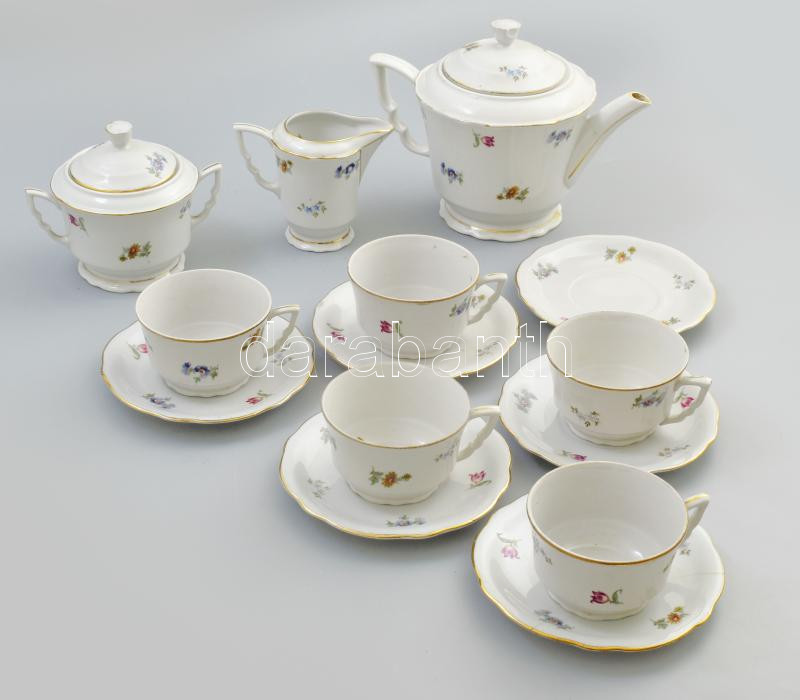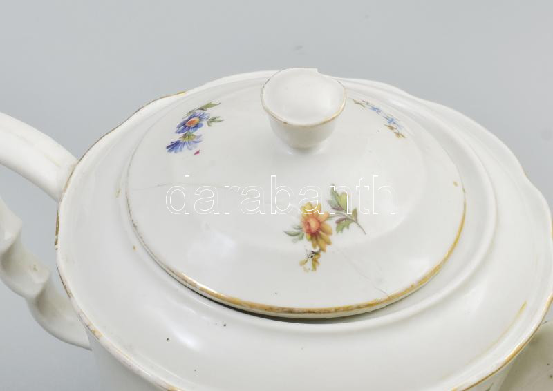 Beschreibung: Zsolnay virágmintás 5 személyes porcelán teás készlet. Matricás, jelzett, kopásnyomokkal, kanna fedele ragasztott és lepattanással, egyik csészealjon repedéssel.