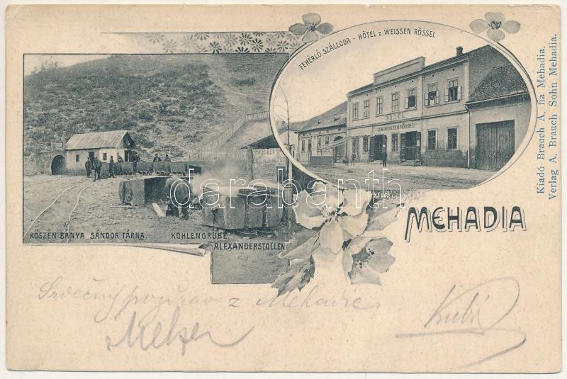 1906 Mehádia, Kőszén bánya, Sándor Tárna, iparvasút, Fehérló szálloda. Brauch A. fia kiadása / Kohlengrube, Alexanderstollen, Hotel zum weissen Rössel / coal mine, industrial railway, hotel. Art Nouveau, floral (Rb)
