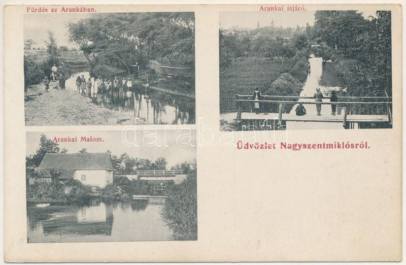 Nagyszentmiklós, Sannicolau Mare; Fürdés az Arankában, Arankai átjáró és malom. Kuharik fényképész felvétele / bathing in the Aranca river, bridge, mill (ragasztónyom / glue marks)