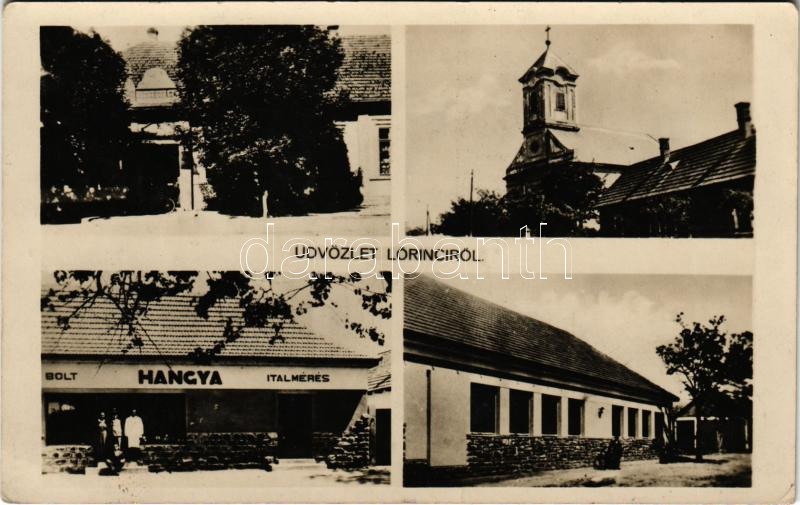 Beschreibung: Lőrinci, Községháza, Római katolikus templom, Hangya Szövetkezet üzlete, bolt és italmérés, Iskola (EK)