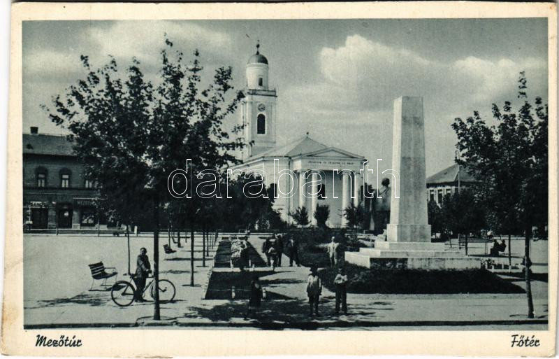 Beschreibung: Mezőtúr, Fő tér, Református templom, Hősök szobra, emlékmű, üzletek (vágott / cut)