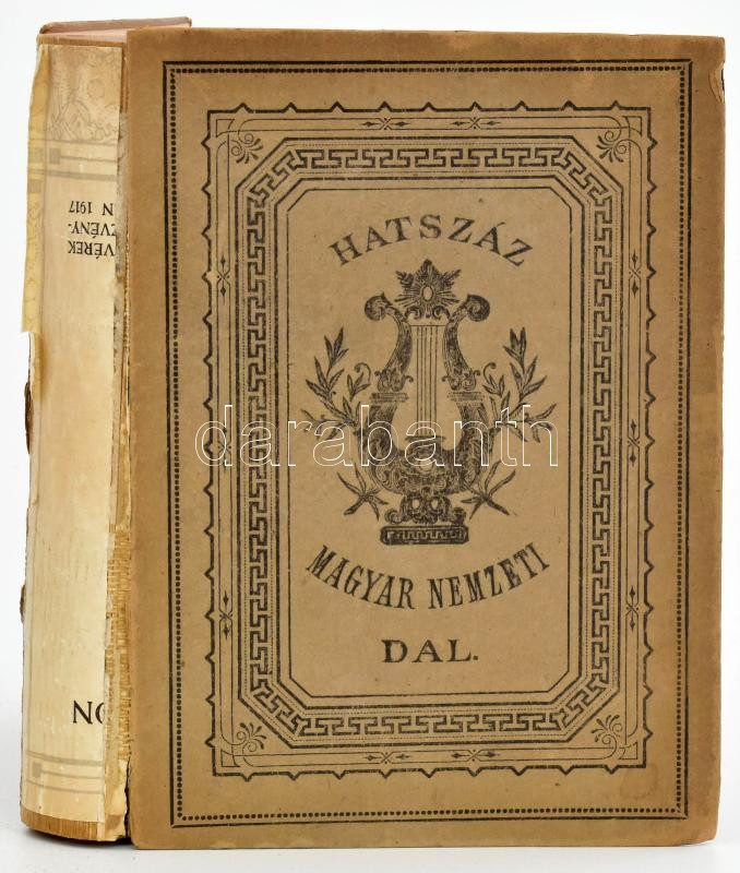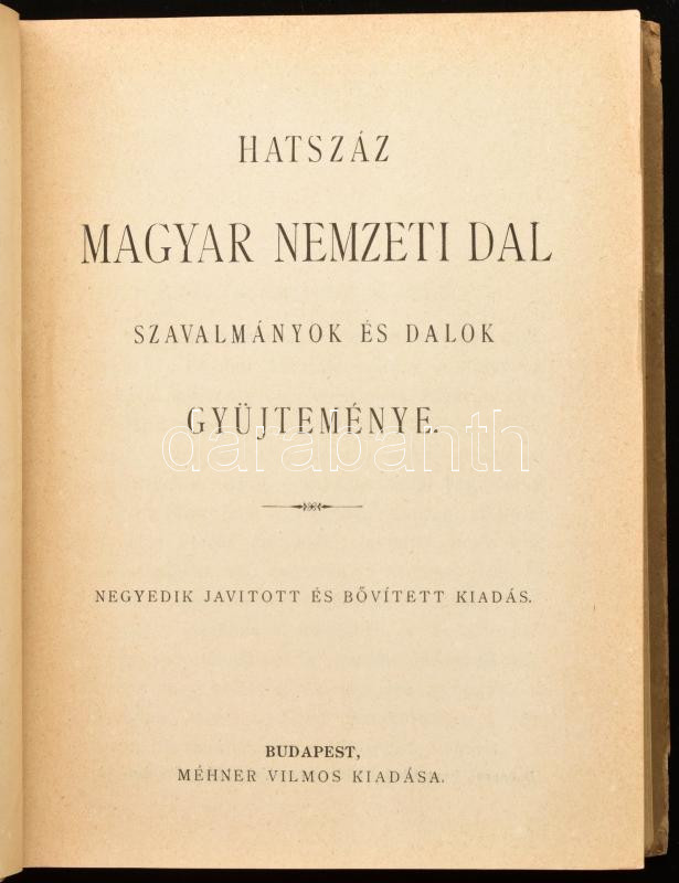 Hatszáz magyar nemzeti dal szavalmányok és dalok gyüjteménye. Bp.,én,Méhner Vilmos. Negyedik kiadás. Kiadói kartonált papírkötés, kissé kopott borítóval, hiányzó gerinccel.