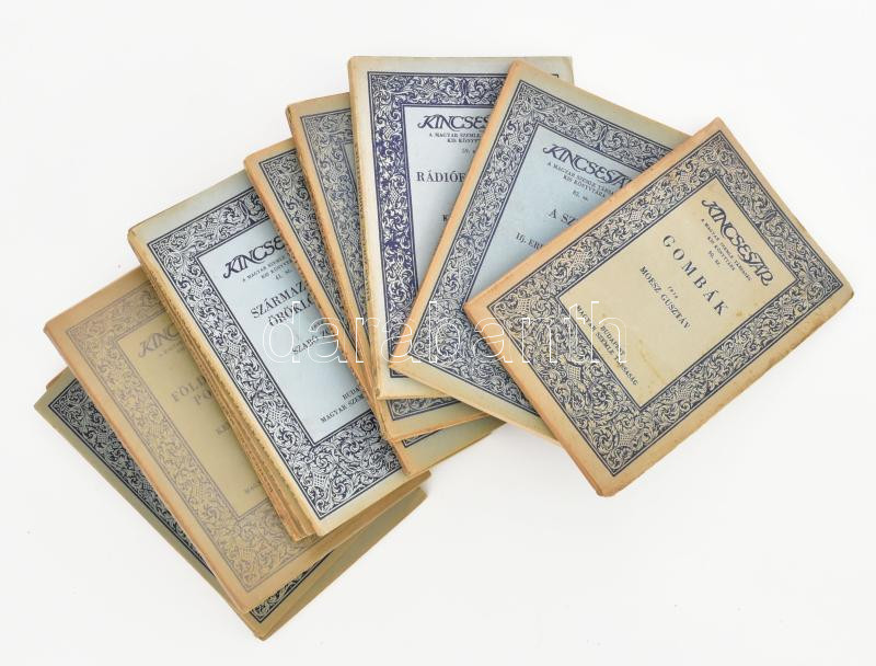 Kincsestár sorozat 12 kötete: Moesz Gusztáv: A gombák.; Ifj. Erdély Sándor: A szén.; Kilián Zoltán: Rádióesztétika.; Szőllősy Lajos: A táplálkozás.; Szabó Vendel: Katholicizmus.; Szabó Zoltán: Származás és öröklődés.; Zimmermann Ágoston: Fejlődéstan.; Bartucz Lajos: Mikép fedezte fel az ember önmagát?; Burger Károly: Az egészséges nő.; Kerék Mihály: Földbirtokpolitika.; Czettler Jenő: Agrárpolitika.; Ihrig Károly: A szövetkezetek. Bp., 1929-1943, Magyar Szemle Társaság. Kiadói papírkötés, változó állapotban.