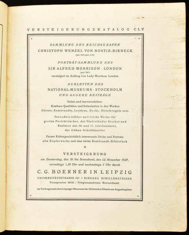 Kupferstiche alter Meister. Sammlung des Reichsgrafen Wenzel von Nostiz-Rieneck. Porträtsammlung Sir Alfred Morrison - London. Versteigerung durch C. G. Boerner in Leipzig vom 10. bis 12. November 1927. (Árverési katalógus). Leipzig, 1927, Poeschel & Trepte, 2 sztl. lev.+ 198+(2) p.+ XXXIV (fekete-fehér képek) t. Német nyelven. Kiadói papírkötés, sérült, foltos borítóval, az első két lap sérült, javított.