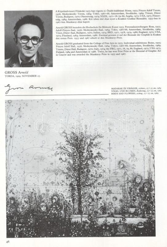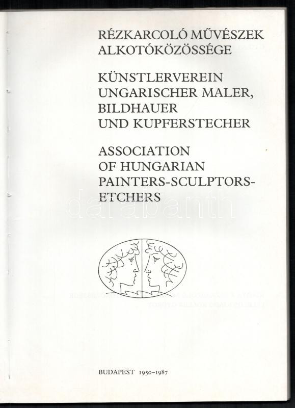 Menyhárt László: Rézkarcoló Művészek Alkotóközössége 1950-1987. (Kiállítási katalógus). Bp., 1987, Rézkarcoló Művészek Alkotóközössége. Benne Barcsay Jenő, Borsos Miklós, Gross Arnold, Gyulai Líviusz, Kass János, Korga György, László Gyula, Mácsai István, Melocco Miklós, Reich Károly, Rékassy Csaba, Szabó Vladimir, Szalay Lajos, Szász Endre, Würtz Ádám és más művészek. Gazdag képanyaggal illusztrálva. Magyar, német és angol nyelven. Kiadói papírkötés, kiadói papír védőborítóban, foltos borítóval.