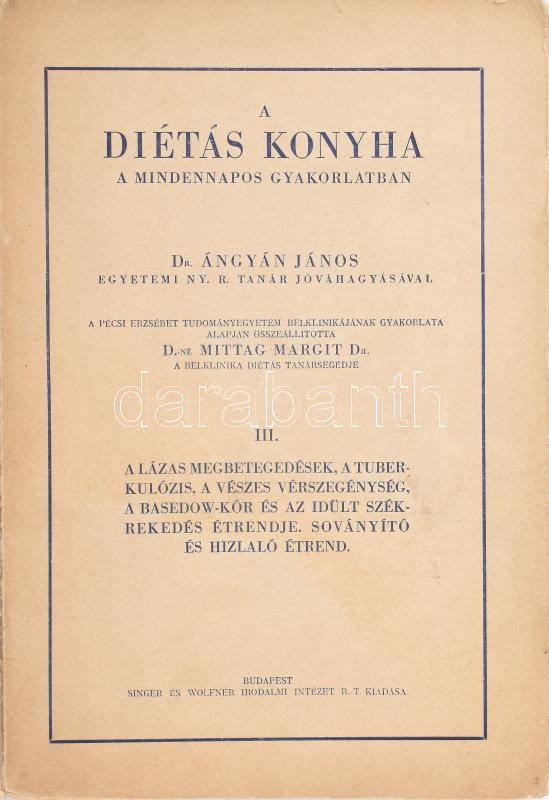 A diétás konyha a mindennapos gyakorlatban. III. könyv: A lázas megbetegedések, a tuberkulózis, a vészes vérszegénység, a Basedow-kór és az idült székrekedés étrendje, soványító és hízlaló étrend. Dr. Angyán János egyetemi ny. r. tanár jóváhagyásával. Tulajdonosi bejegyzéssel. Bp., 1932., Singer és Wolfner. Kiadói papírkötésben. Jó állapotban