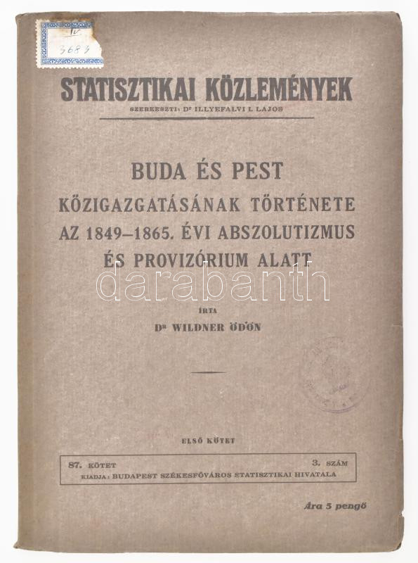 Wildner Ödön: Buda és Pest közigazgatásának története az 1849-1865. évi abszolutizmus és provizórium alatt. Statisztikai Közlemények 87. kötet. 3. szám. Bp., 1937., Budapest Főváros Statisztikai Hivatala,(Budapest Székesfőváros Házinyomdája), 92+1 p. Kiadói papírkötés, régi intézményi bélyegzéssel, a borítón címkenyomokkal.