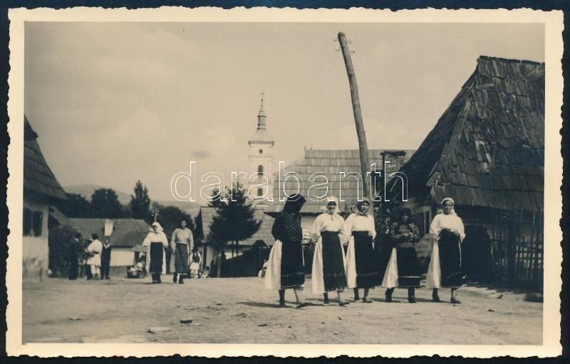 cca 1940 Kisrebra (Rebrisoara), Erdély, utcarészlet, román népviseletbe öltözött falubeliek, háttérben a görögkatolikus templom. A hátoldalon feliratozott fotó, 13,5x8,5 cm