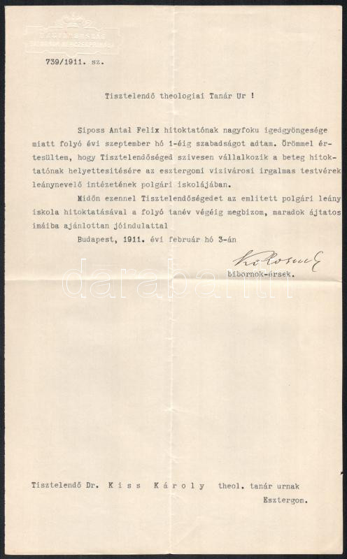 1911 Vaszary Kolos (1832-1915) bíboros hitoktatói kinevezése saját kez... https://www.darabanth.com/de/458-Fernauktion/458.0/Kunst-Dokumente-andere-Sammelgebiete/Dokument~1000021/1911-Vaszary-Kolos-1832-1915-biboros-hitoktatoi-kinevezese-sajat-kezu-alairasaval-hajtva-szep~II3067346