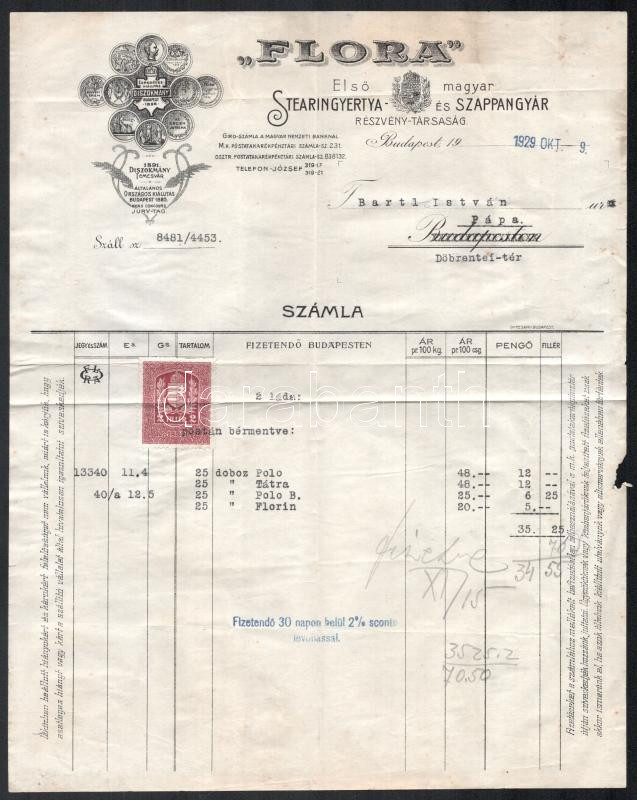 Beschreibung: 1929 "FLORA" Első Magyar Stearingyertya és Szappangyár R.T. Ezredéves kiállítás díszokmányyal és további 9 kitüntetéssel illusztrált dekoratív fejléces számla