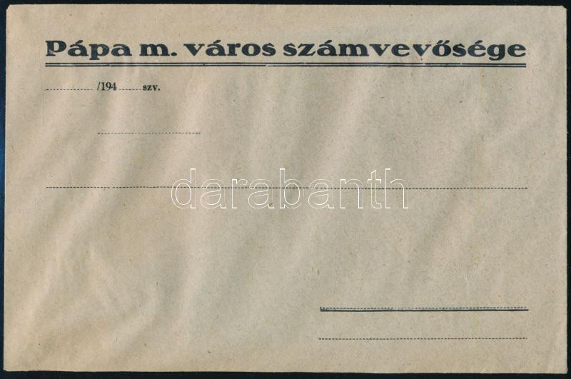 cca 1940 Pápa m. város számvevősége boríték https://www.darabanth.com/de/458-Fernauktion/458.0/Kunst-Dokumente-andere-Sammelgebiete/Drucksachen~1500039/cca-1940-Papa-m-varos-szamvevosege-boritek~II3068170