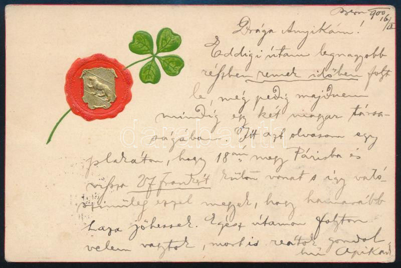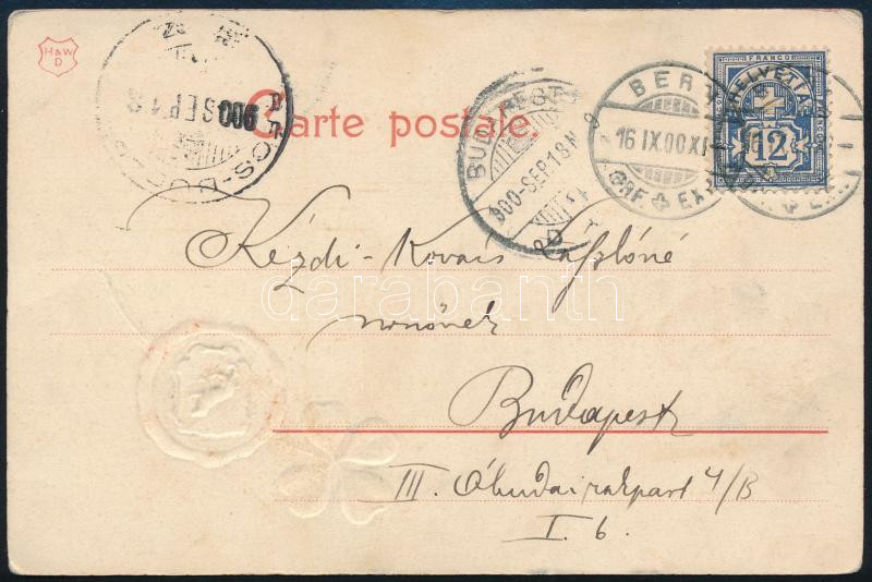 Beschreibung: 1900 Kézdi-Kovács László (1864-1942) festőművész, műkritikus saját kezűleg megírt képeslapja felesége, Kézdi-Kovács Lászlóné részére, Svájcból hazaküldve (dombornyomott lóhere motívummal)