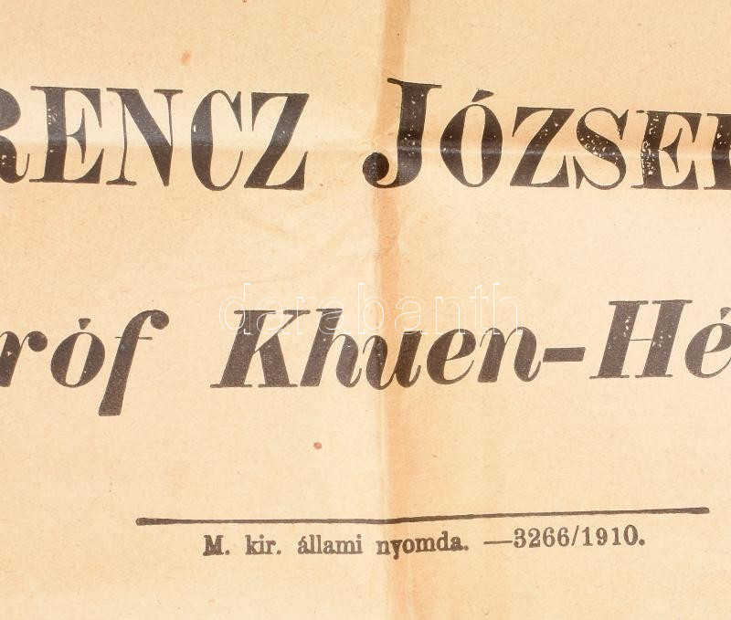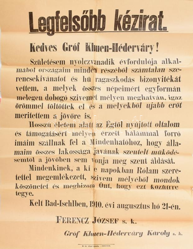 1910 Ferenc József császár 80. születésnapja alkalmából kifejezett köszönete Khuen-Héderváry miniszterelnöknek címezve, Falragasz formájában kinyomtatva. Hajtva 50x70 cm