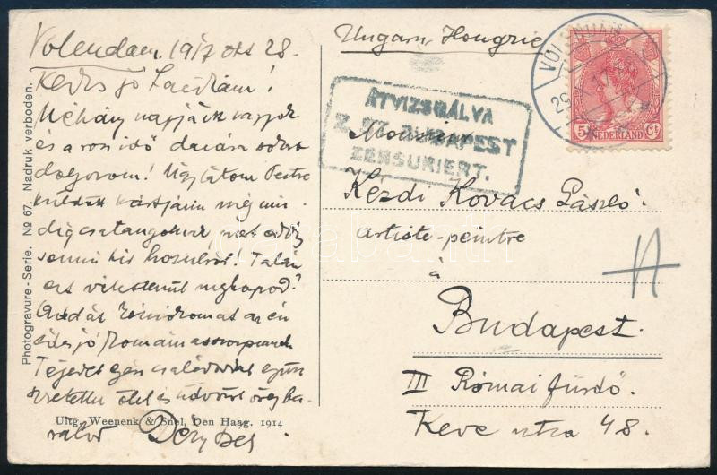 1917 Déry Béla (1868-1932) festőművész, a Nemzeti Szalon igazgatójának saját kezűleg megírt képeslapja Kézdi-Kovács László (1864-1942) festőművész, műkritikus részére, Hollandiából hazaküldve, cenzori bélyegzéssel