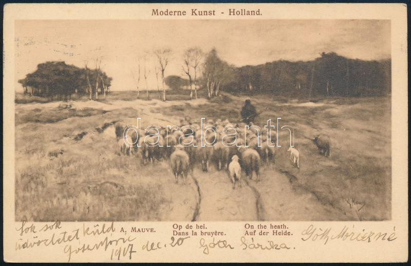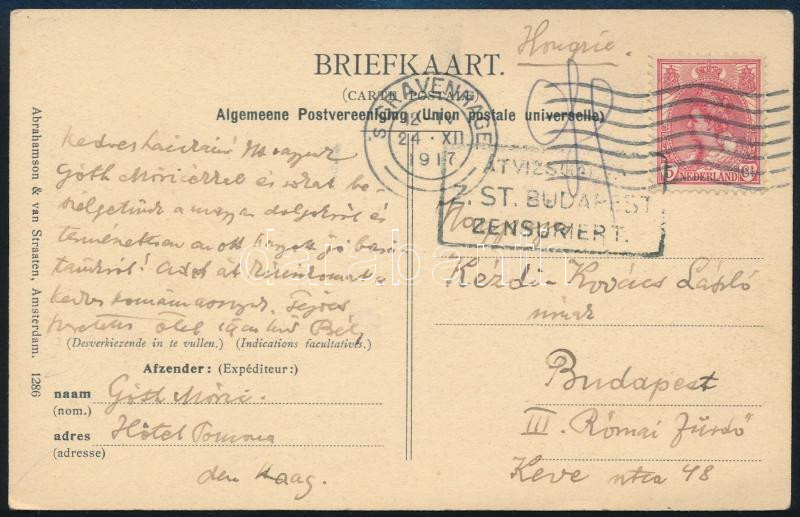 Beschreibung: 1917 Góth Móric (1873-1944) festőművész saját kezűleg megírt képeslapja Kézdi-Kovács László (1864-1942) festőművész, műkritikus részére, Hollandiából hazaküldve, Góth Móric és családja aláírásaival