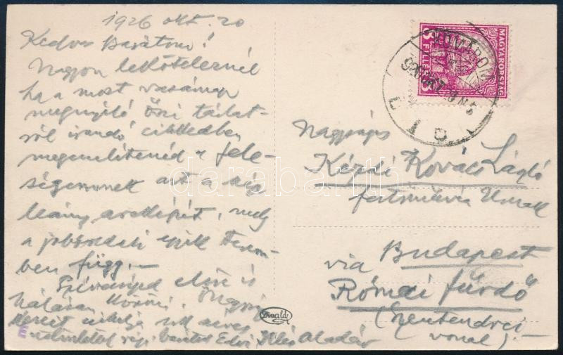 Beschreibung: 1926 Edvi-Illés Aladár (1870-1953) festőművész saját kezűleg megírt képeslapja Kézdi-Kovács László (1864-1942) festőművész, műkritikus részére