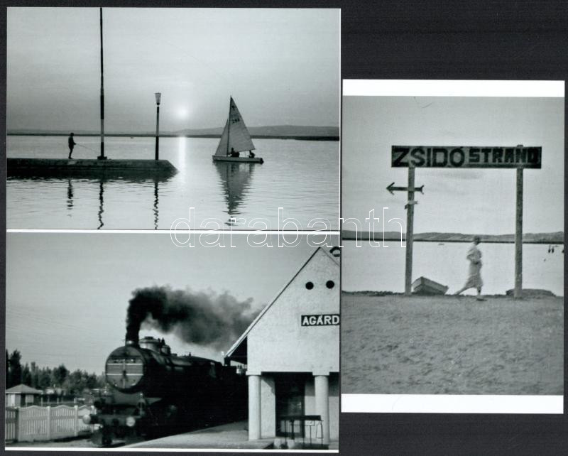 A Velencei-tónál kijelölt zsidó strand irányjelző táblája, az agárdi vasútállomás és a móló vitorlással, összesen 3 db modern nagyítás, különféle időpontokban készült felvételekről, jelzés nélkül, 10x15 cm