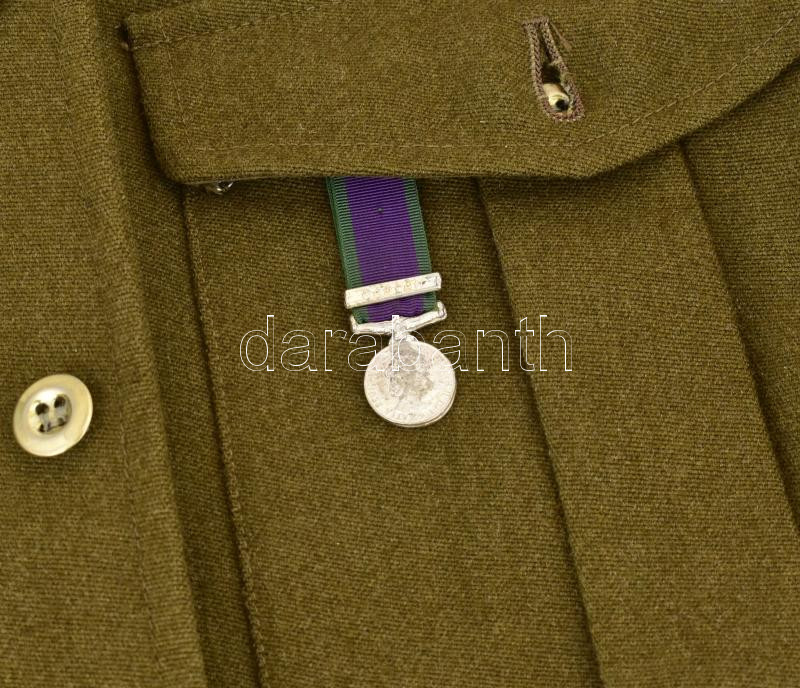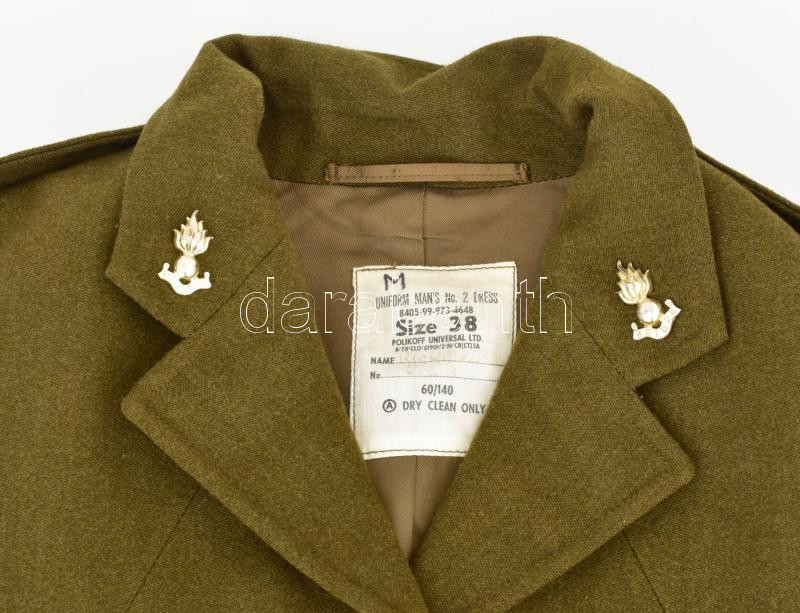 Brit Hadsereg egyenruha zubbony, tüzér gallérjelvénnyel és miniatűr kitüntetéssel. Jelzett, jó állapotban, méret: 38 / British Army 'Uniform Man's No. 2 Dress' jacket, with artillery collar badge and miniature medal, in good condition, size: 38