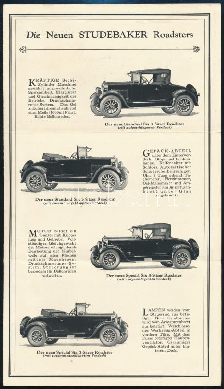 cca 1930 Studebaker amerikai autók, kihajtható képes reklámnyomtatvány... https://www.darabanth.com/de/458-Fernauktion/458.0/Kunst-Dokumente-andere-Sammelgebiete/Werbungen~1500036/cca-1930-Studebaker-amerikai-autok-kihajthato-kepes-reklamnyomtatvany-30x27-cm~II3068501