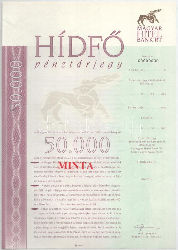 ~1990. "HÍDFŐ pénztárjegy" a Magyar Hitel Bank bemutatóra szóló pénztá... https://www.darabanth.com/de/458-Fernauktion/458.0/Numismatik/Aktien-und-Tickets~500005/7E1990-HIDFO-penztarjegy-a-Magyar-Hitel-Bank-bemutatora-szolo-penztarjegye-MINTA~II3062462