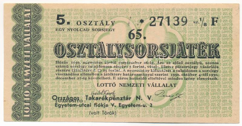 Budapest 1950. "65. Osztálysorsjáték" 5. osztály 1/8 sorsjegy, "F"-sor... https://www.darabanth.com/de/458-Fernauktion/458.0/Numismatik/Aktien-und-Tickets~500005/Budapest-1950-65-Osztalysorsjatek-5-osztaly-18-sorsjegy-F-sorozat-Orszagos~II3063185