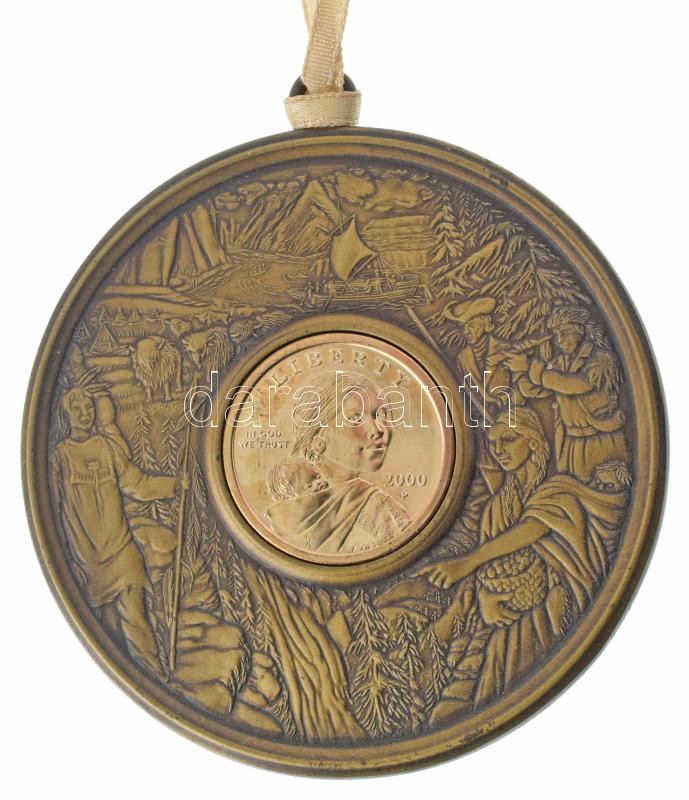 Amerikai Egyesült Államok 2000P 1$ aranyozott Cu "Sacagawea" aranyozott bronz emlékérembe foglalva, mely karácsonyi díszként funkcionál. Eredeti, kissé sérült Hallmark-os dísztokban, ismertetővel (73mm) T:UNC,AU patina, az emlékérem aranyozása kissé kopott USA 2000P 1 Dollar gold plated Cu "Sacagawea" enclosed in a gilded bronze commemorative medallion, which functions as a Christmas decoration. In original, slightly damaged Hallmark decorative case with information sheet (73mm) C:UNC,AU patina, slightly worn gilt on the medallion