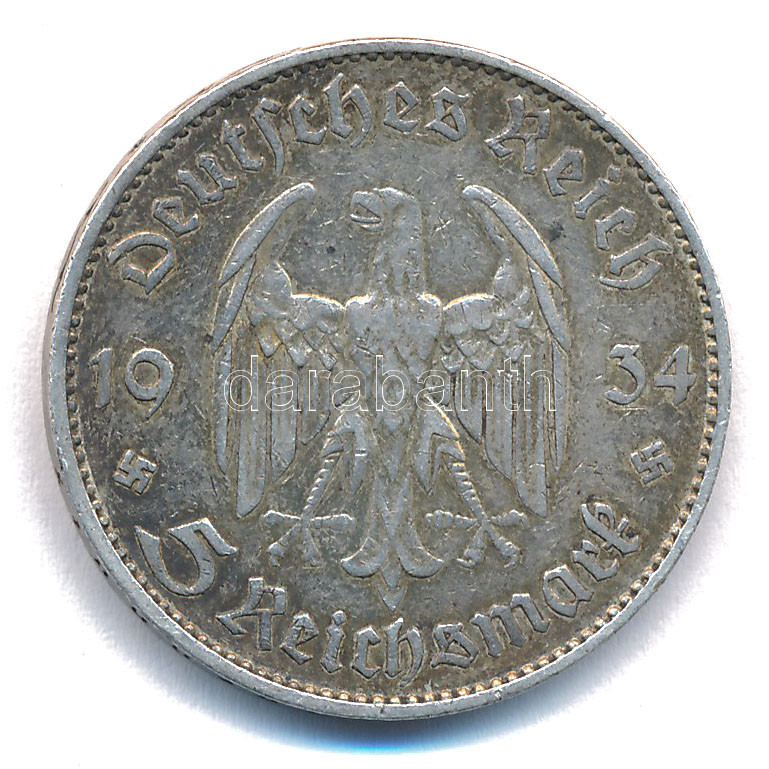 Német Harmadik Birodalom 1934F 5M Ag "Garnisonkirche" T:VF kis ph. German Third Reich 1934F 5 Reichsmark Ag "Garnisonkirche" C:VF small edge error Krause KM#83