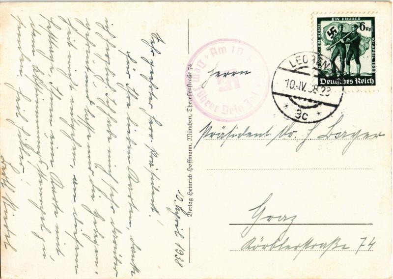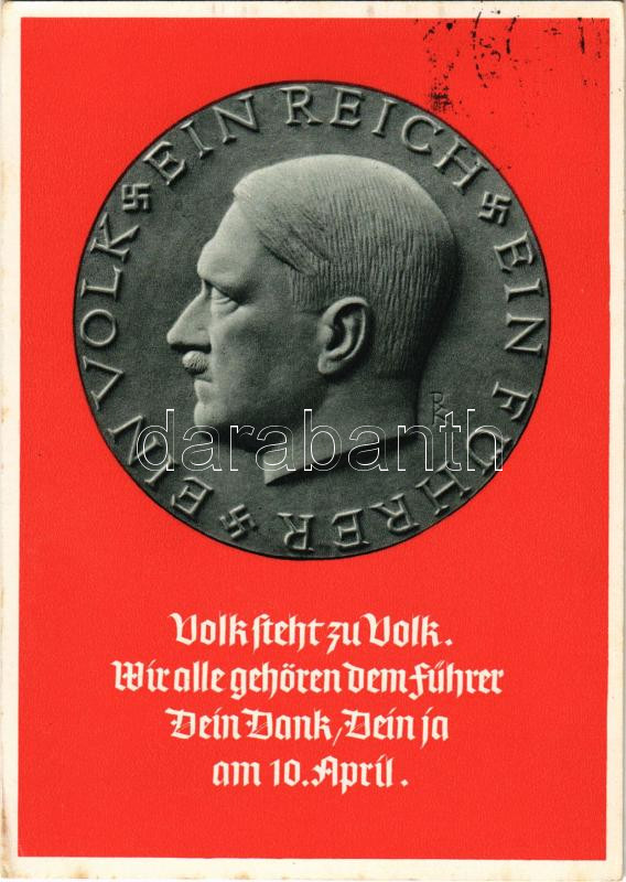 1938 Ein Volk, ein Reich, ein Führer. Volk steht zu Volk. Wir alle gehören dem Führer Dein Dank, Dein ja am 10. April / Adolf Hitler, NSDAP German Nazi Party propaganda, swastika; 6 Ga. + So. Stpl.