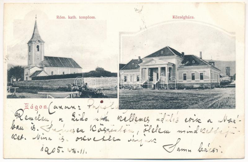 Beschreibung: 1905 Zágon, Zagon (Kovászna, Covasna); Római katolikus templom, Községháza / church, town hall