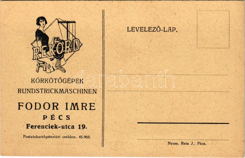 1935 Rekord körkötőgépek reklámja. Fodor Imre, Pécs, Ferenciek utca 19... https://www.darabanth.com/de/459-Fernauktion/459.0/Ansichtskarten/Werbungen~1500062/1935-Rekord-korkotogepek-reklamja-Fodor-Imre-Pecs-Ferenciek-utca-19-Hungarian-knitting~II3076933
