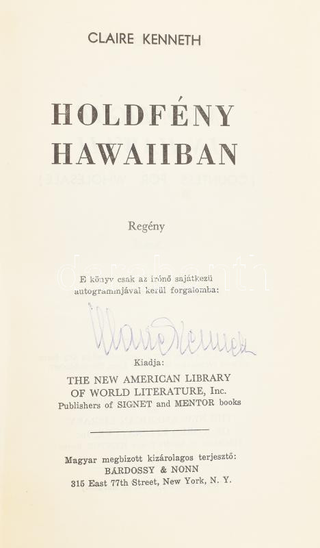 Claire Kenneth: Holdfény Hawaiiban. A szerző által aláírt! New York, 1962, The New American Library of World Literature, Inc. Első, emigráns kiadás. Kiadói egészvászon-kötés, kopottas borítóval, néhány kis folttal. Számozott (2741.), a szerző, Claire Kenneth (Kölcsey Kende Klára) (190-2000) aláírásával ellátott példány.