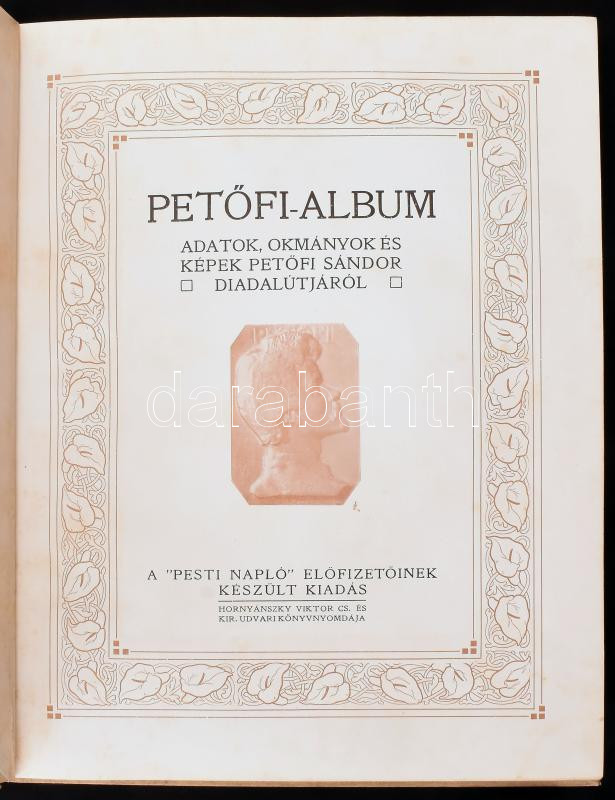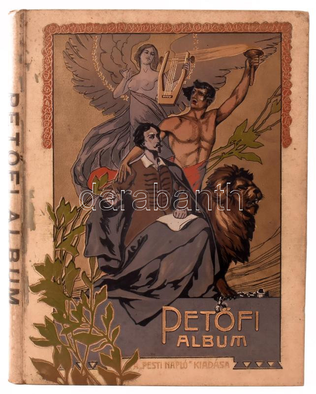 Petőfi-album. Adatok, okmányok és képek Petőfi Sándor diadalútjáról. A "Pesti Napló" előfizetőinek készült kiadás. (Bp. 1907), Hornyánszky-ny., 140 p.+ 10 (színes műmellékletek, feliratozott hártyapapírral) t. Kiadói szecessziós, aranyozott, festett, dombornyomott egészvászon-kötés, koszos borítóval, belül túlnyomórészt jó állapotban.